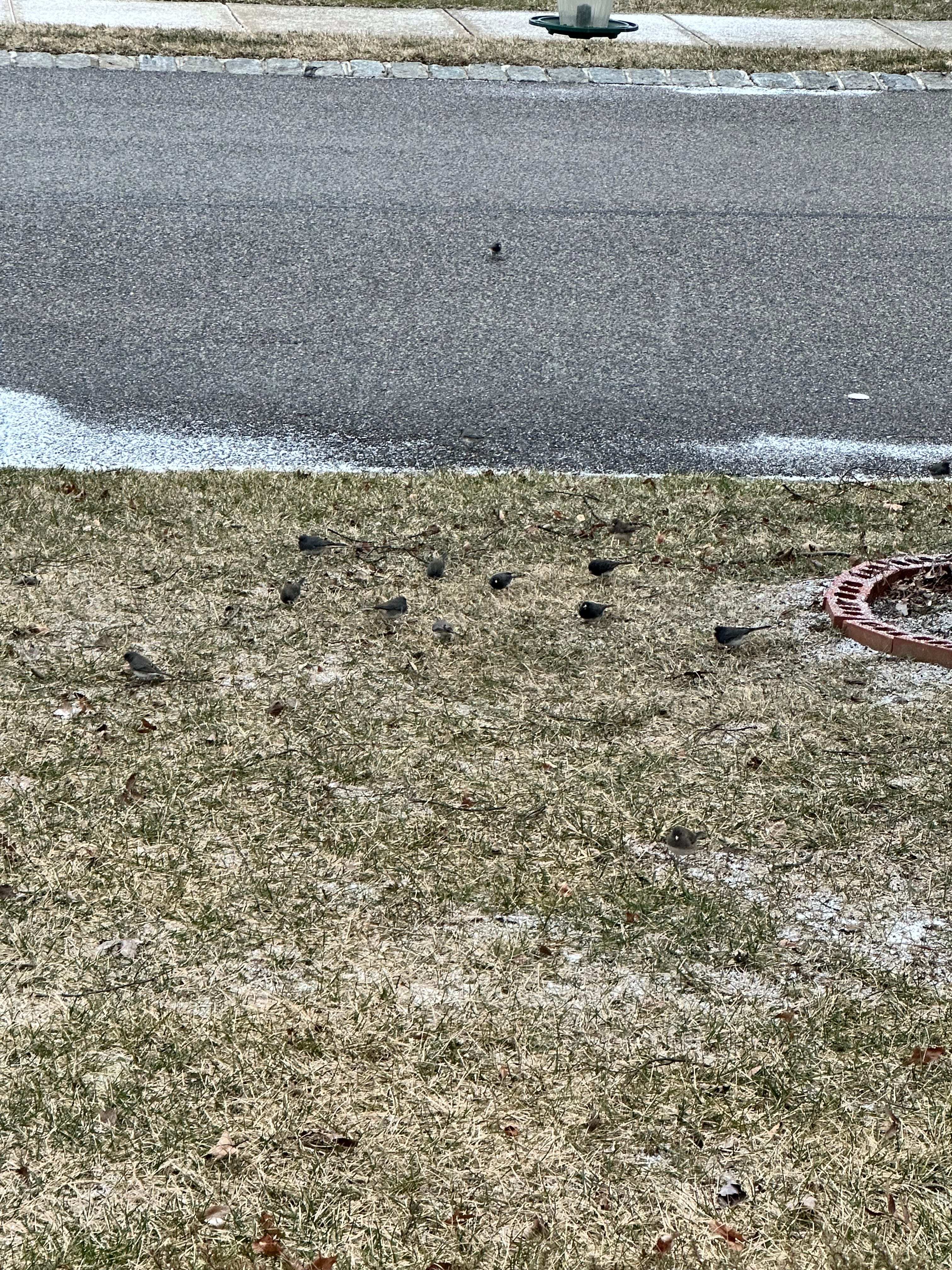 The juncos are calm. They hop around and gorge themselves, preparing for the wintry mix to follow. The feeder birds are messy, so there’s plenty of food on the ground.