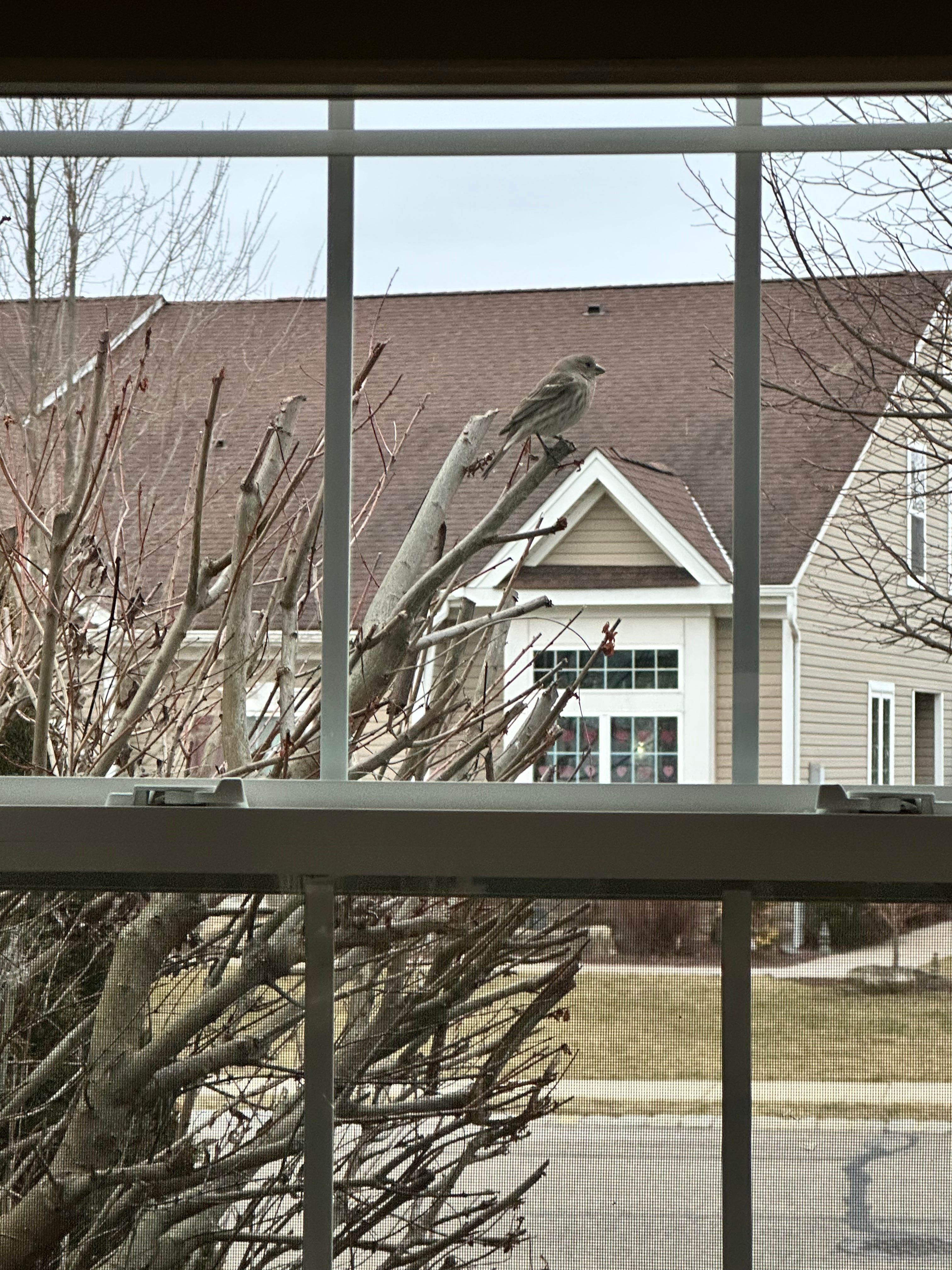 A sparrow hustles to the bare branches of the willow, demanding replenishment. Tabby receives the signal and relays it to me as I shuffle around the kitchen filling kitty bowls with food and water. It will be a few hours before I can fill the feeder. I am plumb out of everything except nyjer seed. I check the finch feeder. It’s pretty full and a few birds are hard at it.